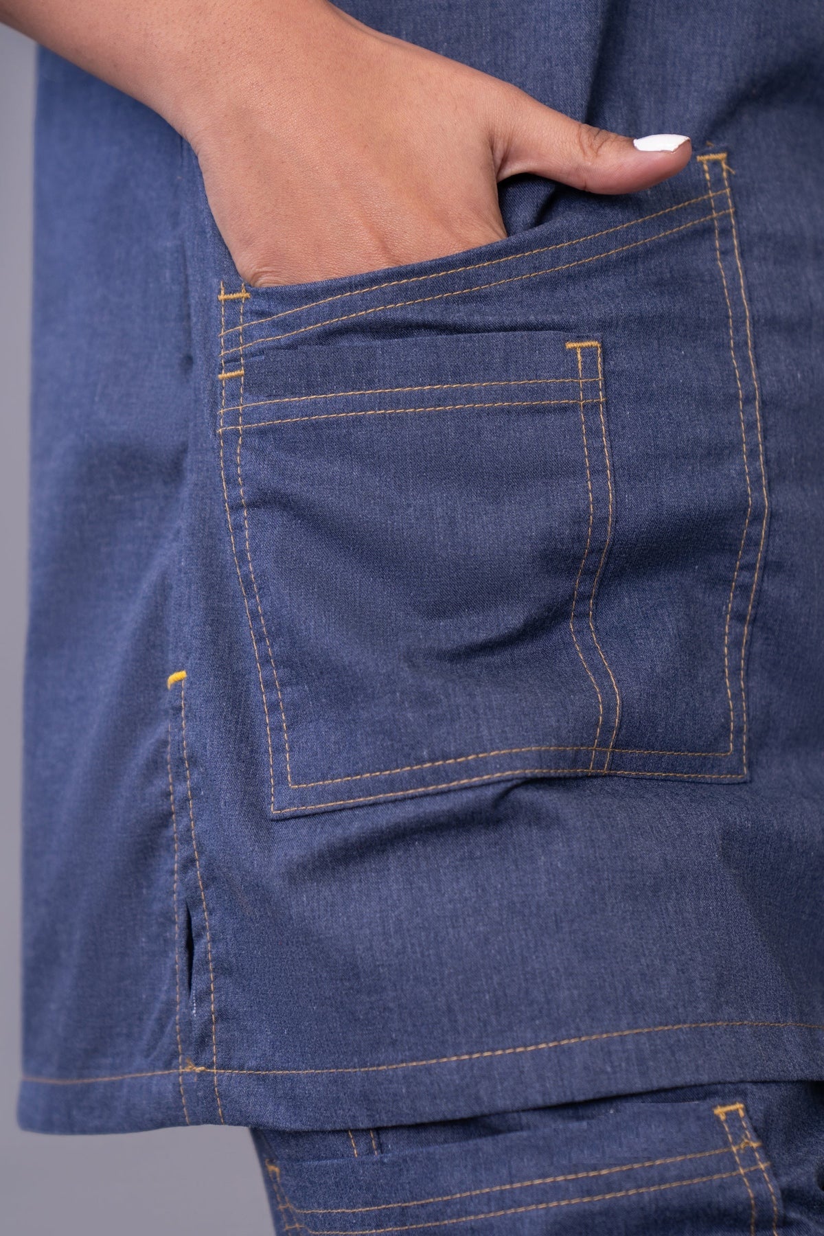 Scrub Top: Stylish V-neck double-needle stitched design, functional pockets, and side bottom vents that provide a relaxed fit.